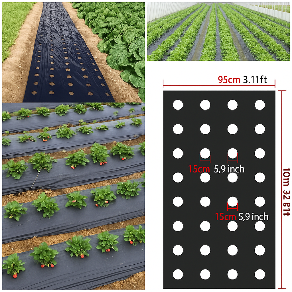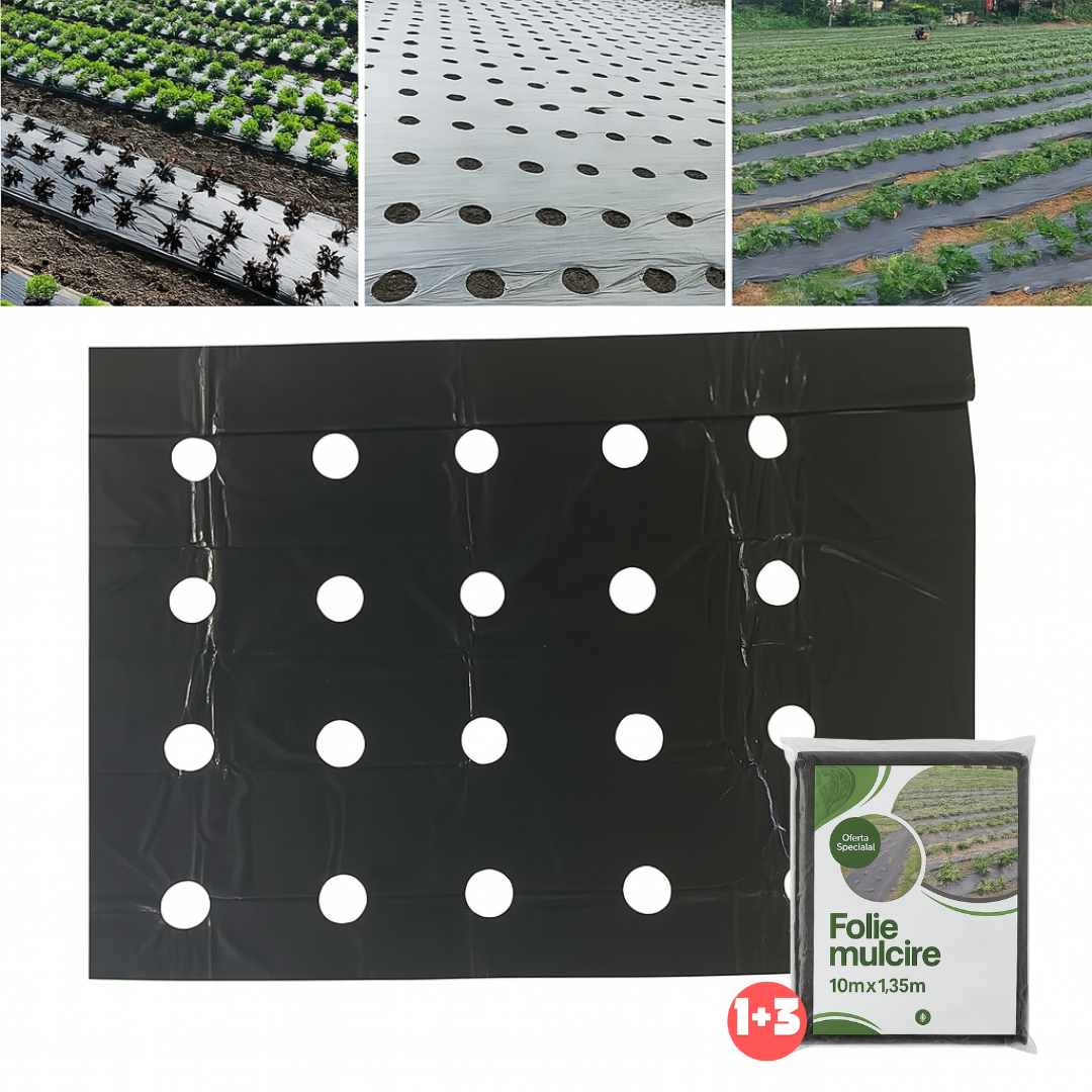 • Fekete talajtakarĂł lemez (1,35 x 10 m) elƑre kialakĂ­tott lyukakkal ĂŒltetĂ©shez.