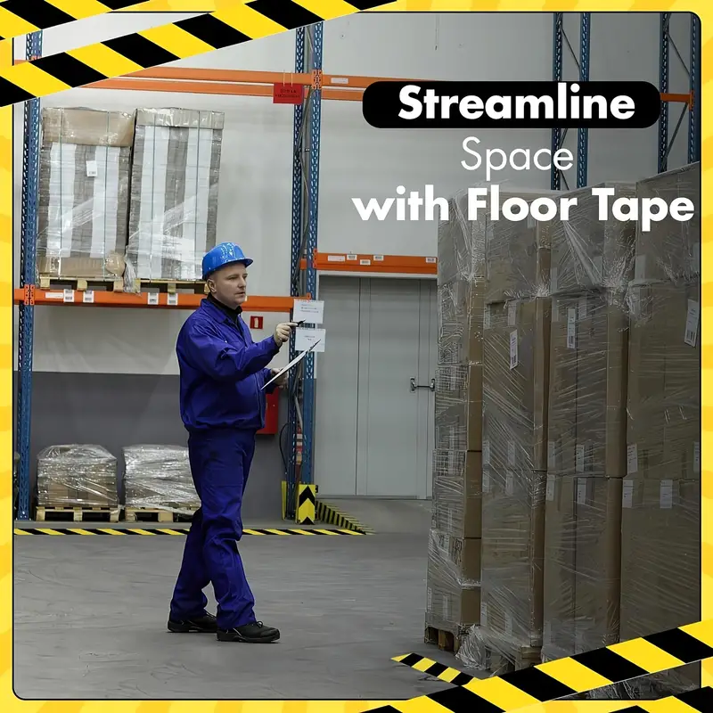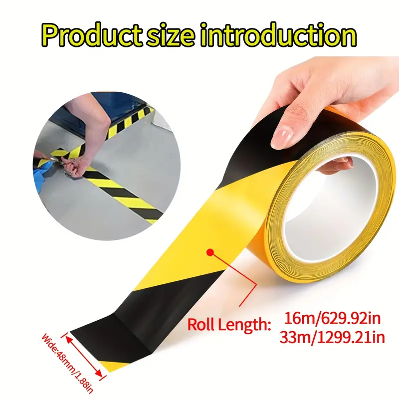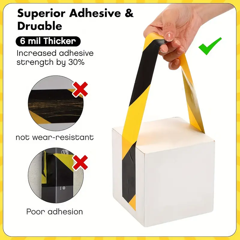 Kiváló minőségű szalag: A padlójelölő szalag hátlapként lágyított polivinil-kloridból (PVC) készül, prémium minőségű természetes gumi ragasztóval van bevonva, és tartós tulajdonságokkal rendelkezik.