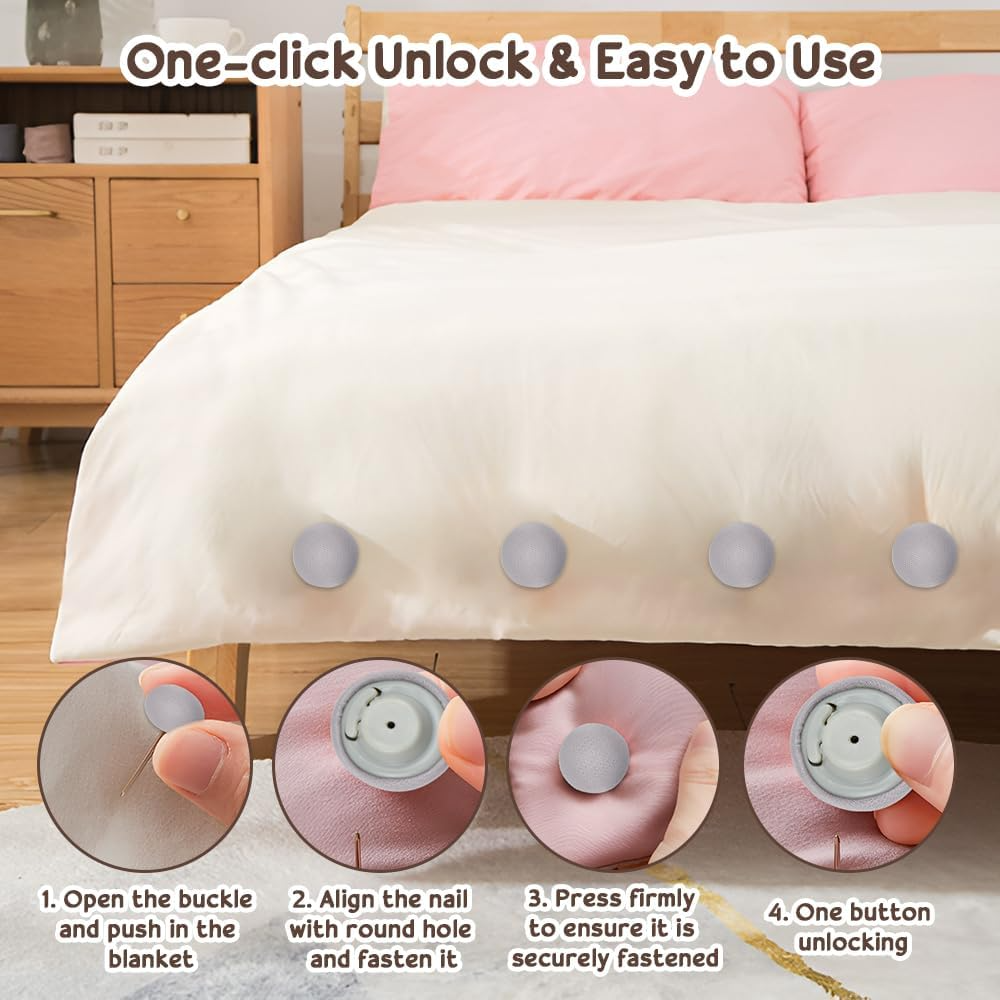 - 【Egy kattintással nyitható és könnyen használható】: A paplanhuzat tűi egy kattintással nyitható kialakítással rendelkeznek, amely könnyű és tartós, nincs mágnes, nincs sugárzás és könnyen használható. Egyszerűen nyomja át a tűt a paplanon, és helyezzen egy szöget a kerek lyukba a másik végén a rögzítéshez.