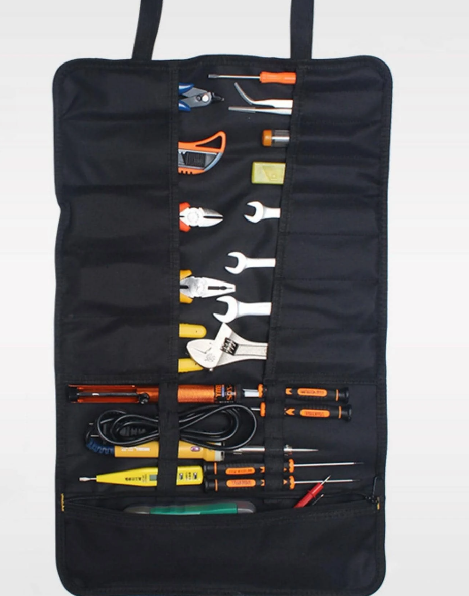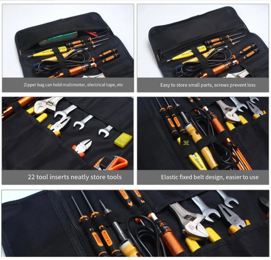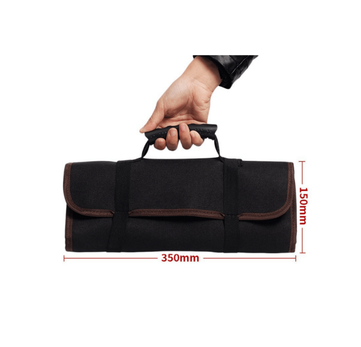 Könnyen tekerhető és hordozható: Két elasztikus pánt zárja le a szerszámrendezőt, amikor feltekerjük, így a szerszámok nem esnek ki. Kényelmes, a tetején található fogantyú a könnyű hordozhatóság érdekében.