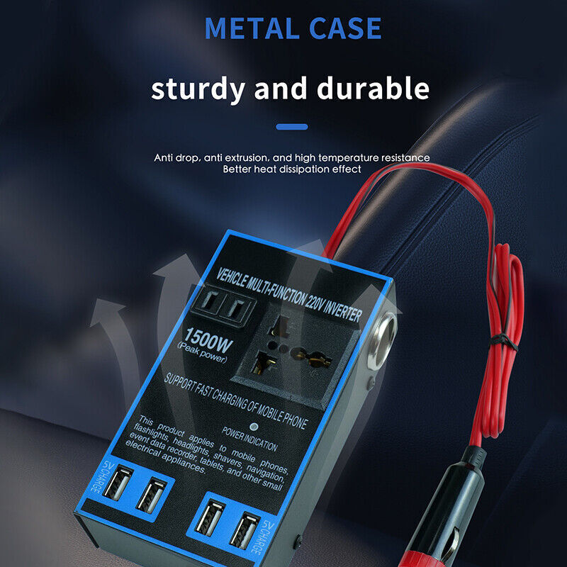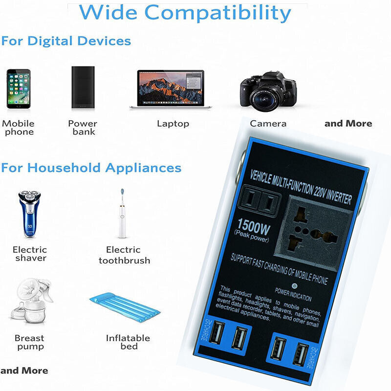 【Gyors töltés】 Ez az 1500 W-os autós inverter kettős 220 V-os AC csatlakozóval és 4 USB-porttal rendelkezik. Az 5 V-os/kettős USB-portok automatikusan felismerik az eszközeidet, hogy optimális töltési sebességet biztosítsanak, így kiválóan használható Kindle, iPhone, iPad, táblagépek, MP3-lejátszók, kamerák és egyéb mobileszközök számára.