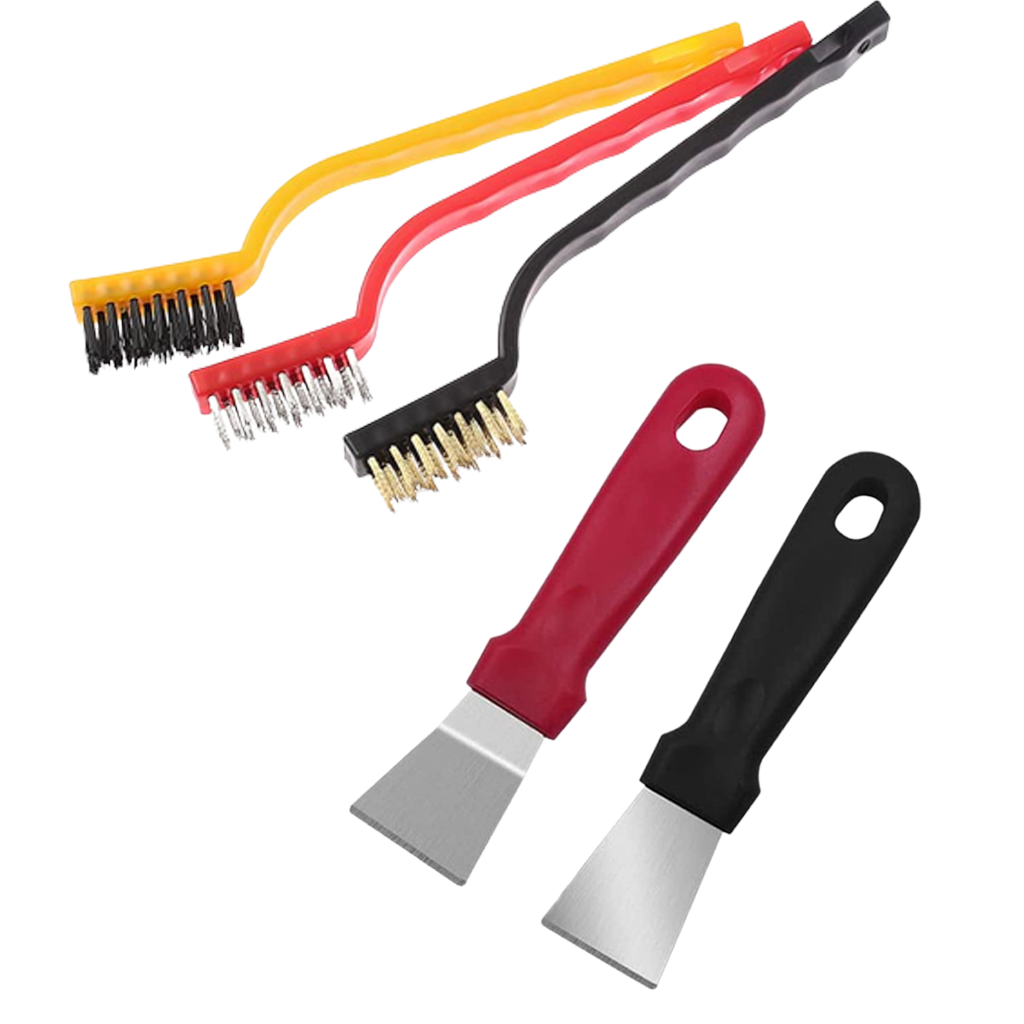 - Két típus: A csomag 3 db kefét és 2 db kaparót tartalmaz. A három kefe kiváló minőségű, különböző tisztítóerővel rendelkező sörtéket tartalmaz, amelyek sűrűek, erősek és tartósak, és minden tisztítási igényt kielégítenek. különböző típusú felületekhez alkalmasak, minden tisztítási problémát megoldanak.