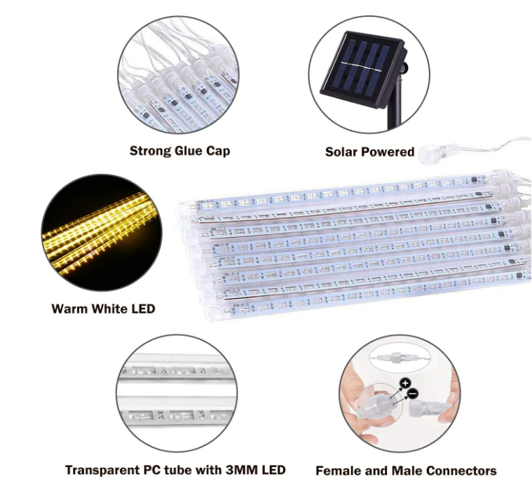 - IP65 Vízálló: A LED-es üdülési kültéri napelemes meteorzuhany lámpák tartós és rugalmas gumihuzalokból készülnek, törésálló műanyag LED-csövekkel, amelyek erősebbek, mint a hagyományos üveg anyaga. Ennél is fontosabb, hogy vízállóak, a téli hóban és a nyári viharokban még mindig óraműként futnak