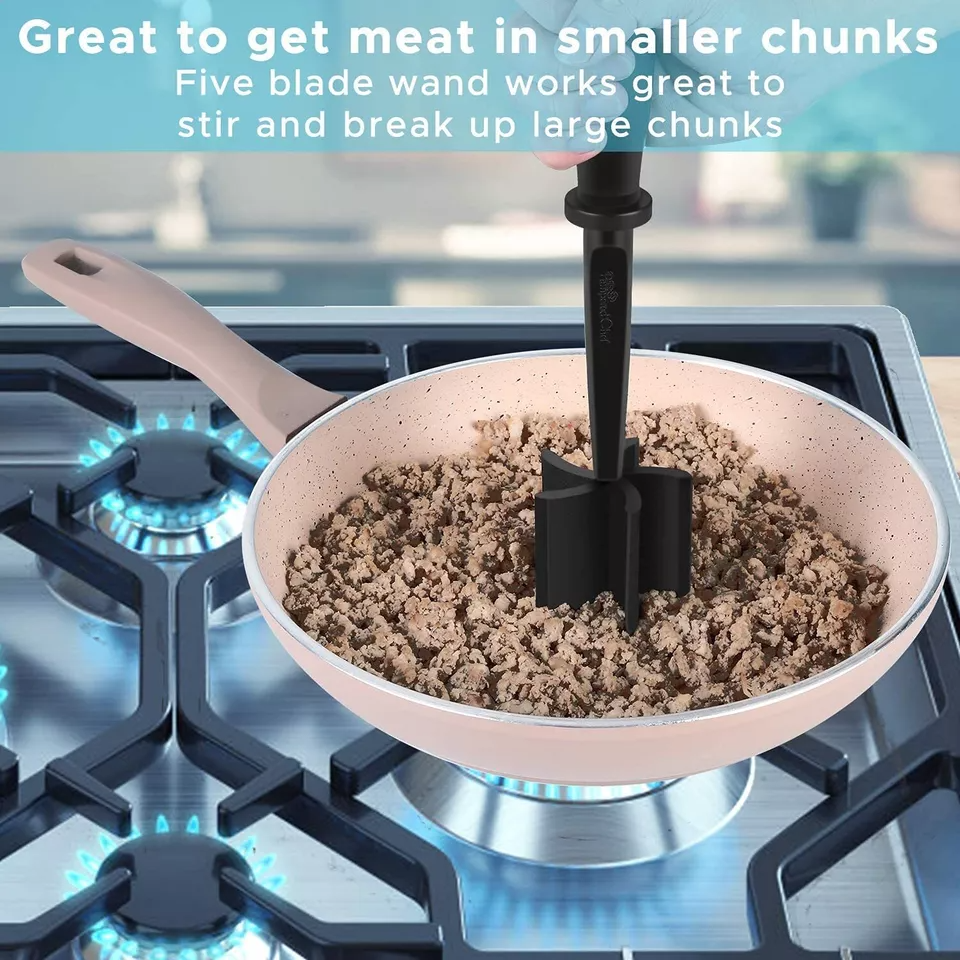 - HŐÁLLÓ >> A Meat Masher élelmiszer-minőségű nylonból készül, amely 430 Fahrenheit fokig hőálló; Biztonságosan használható minden típusú edényen, beleértve a tapadásmentes és bevonatos edényeket is.