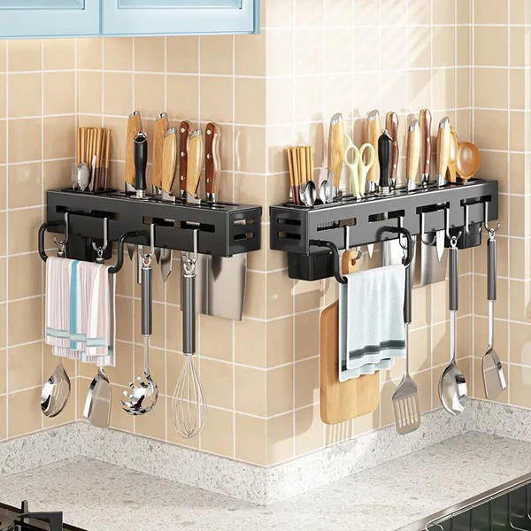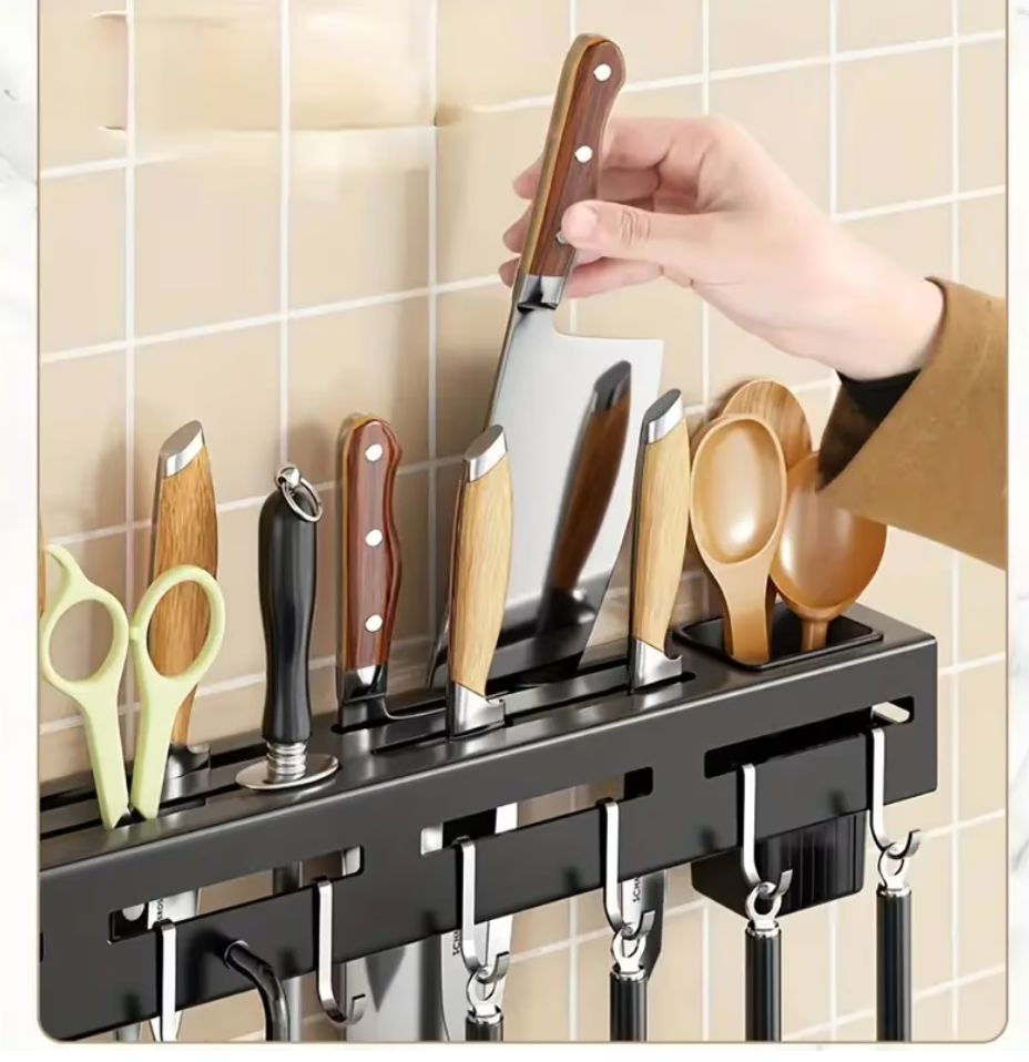 Fali rendszerező a konyhába, 8 akasztó kampóval, késtartóval, fekete