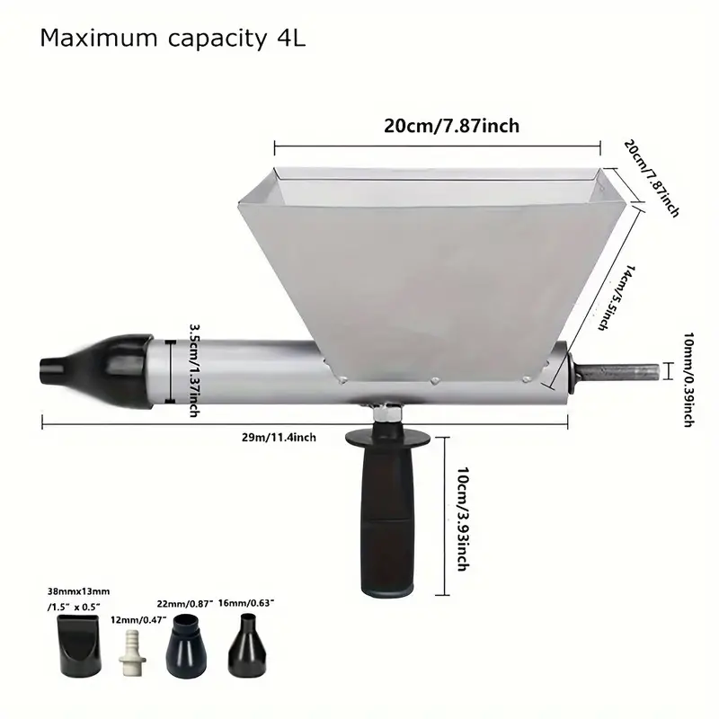 A hordozható habarcsszórót úgy tervezték, hogy javítsa a hézagok és repedések különböző anyagokkal, például cementhabarccsal, gittporral, szilikonnal vagy más tömítőanyagokkal történő kitöltésének hatékonyságát és egyszerűségét. Ideális eszköz kis építési munkákhoz vagy belső és külső tereprendezési projektekhez.