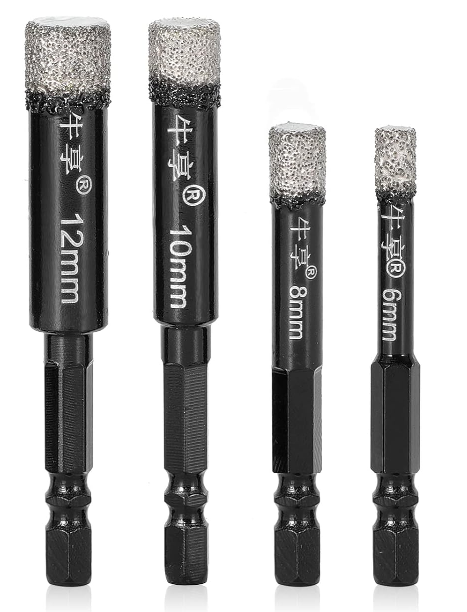 A készlet 4 db gyémánt száraz fúrót tartalmaz, 6 mm (1/4"), 8mm (5/16"), 10 mm (3/8"), 12 mm (1/2", 14 mm átmérőjű).