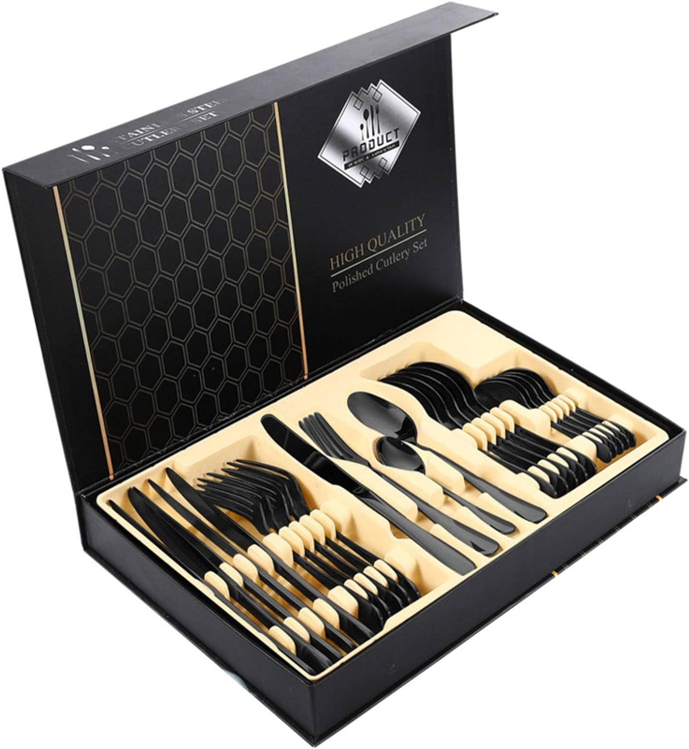 - A 24 darabos evőeszközkészlet 6 darabot tartalmaz: kanalak, villak, kések, teáskanálok, gyönyörű díszdobozba csomagolva, tökéletes házavató, karácsonyi ajándék