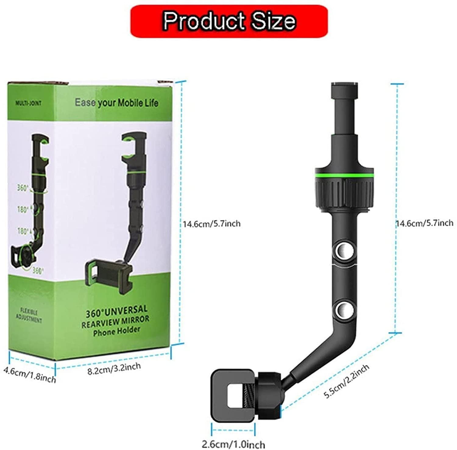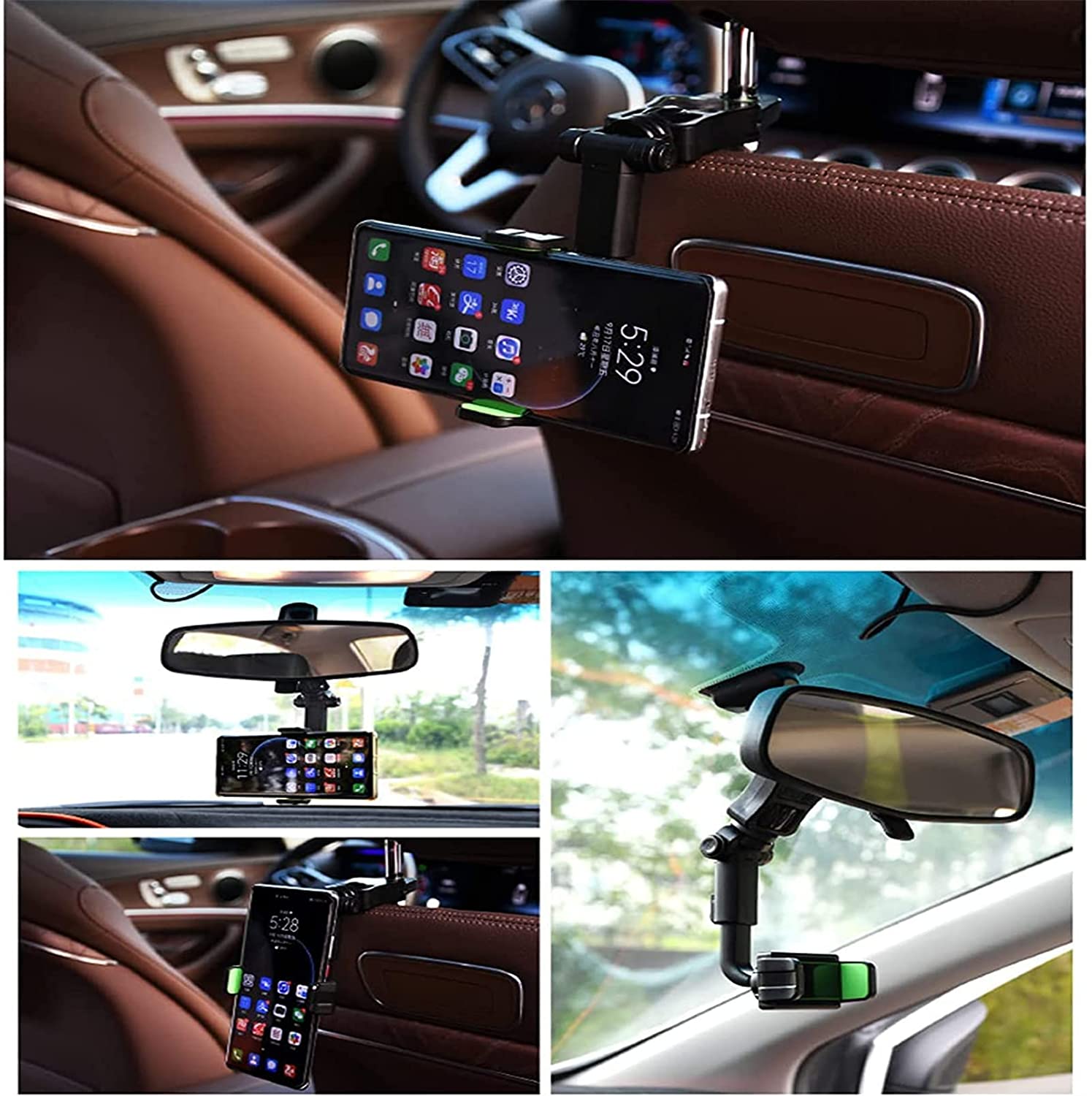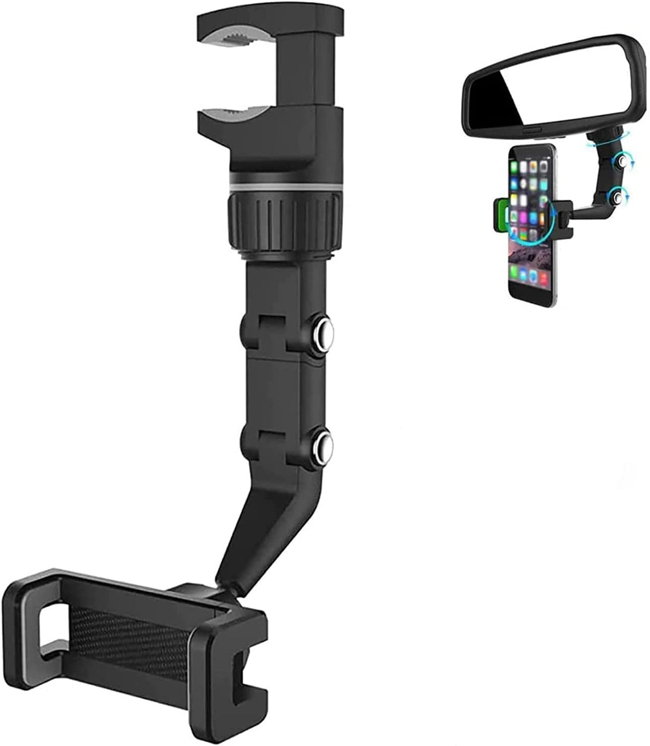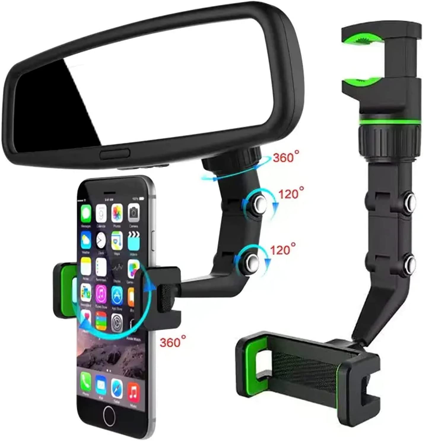 - 360°-os visszapillantó tükör telefontartó: Támogatás a szög tetszés szerinti megváltoztatásához, kényelmes a kívánt navigációs szög beállításához, jobb útvonaltervezés, egyszerű vezetés; Eközben támogatja a vízszintes és függőleges képernyőváltást is, a navigációs szög tetszés szerint állítható.