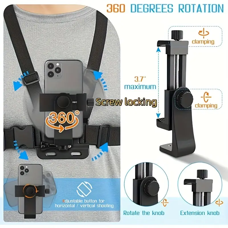 - 【Kiváló választás POV/VLOG-hoz】 A telefon vízszintesen és függőlegesen is elhelyezhető. A J-kampó és a hosszú csavaros kialakítás 90°-ban elforgathatja a telefont. Ennek az övnek a mérete könnyen állítható, a legnagyobb téli kabátokhoz is passzol, sokféle testmérethez alkalmazkodik.