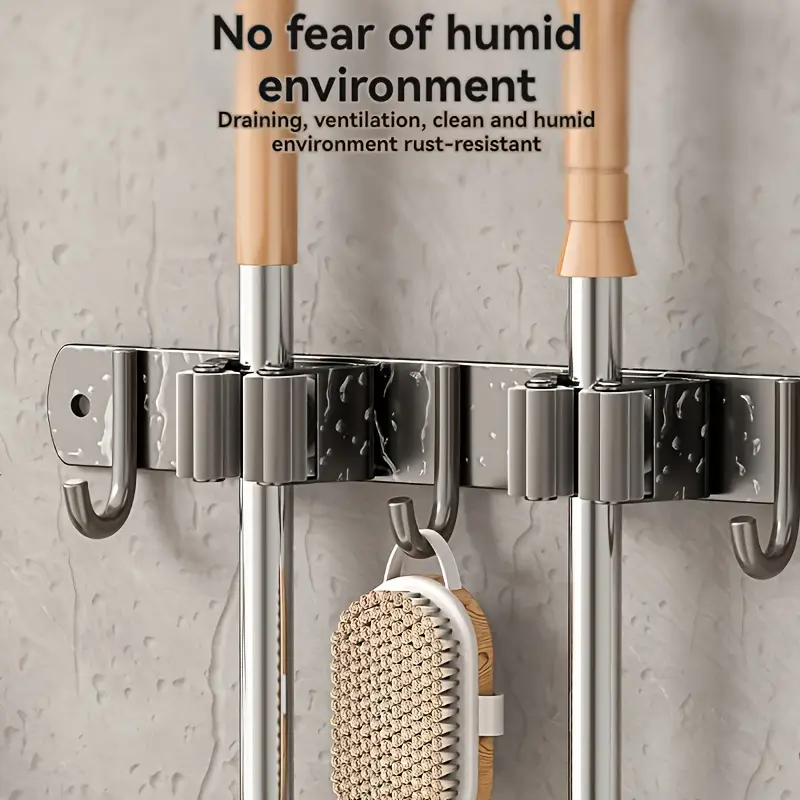 Biztonságos és hatékony kialakítás: A tartó önbeálló bilincseket használ, amelyek szilárdan rögzítik a seprűk, felmosók vagy egyéb szerszámok nyelét, és azonnal kioldják a fogantyú felemelésekor. Legyen szó nedves felmosóról, koszos seprűről vagy baseballütőről, ez a tartó biztosítja, hogy ne csússzanak el.