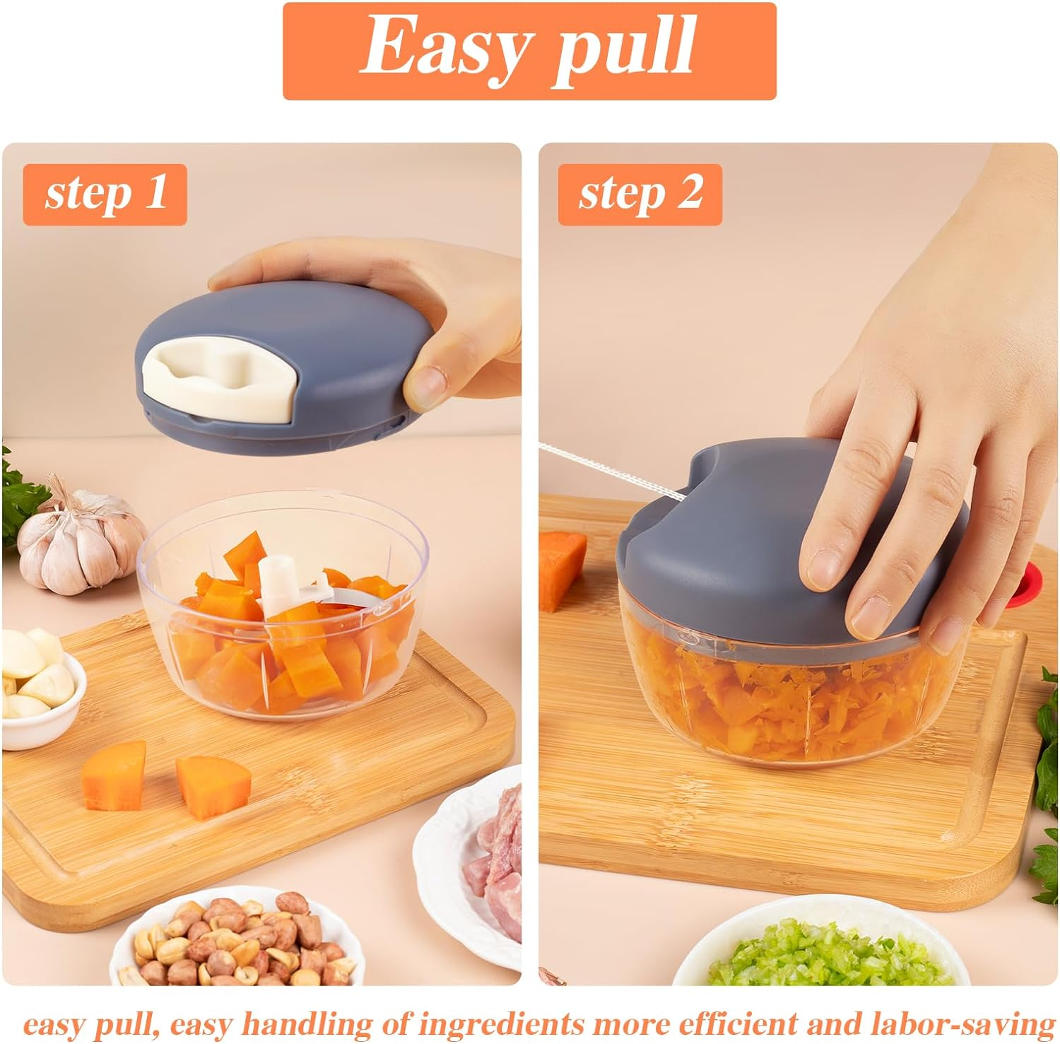 - Könnyű használat: Húzza meg a zsinórt 5-6-szor durva szelethez, 10-12-szer finom granulátumhoz, 14-17-szer finom őrléshez és több mint 20-szor sima püréhez.